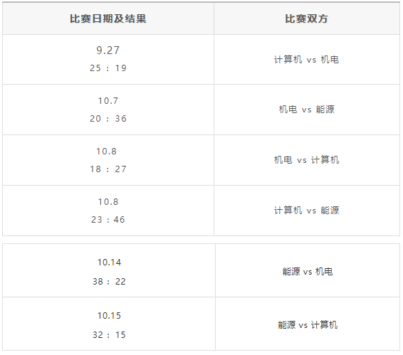 本次新生杯共3支队伍参加比赛,分别是计算机队、能源队和由机设与电气组成的机电队。比赛采取双循环赛制,每支队伍共4场比赛,根据胜场多少排名。经过激烈的角逐,十月中旬,全部比赛结束。最终能源凭借全胜战绩获得第一名;计算机两胜两负,获得第二名;机电队获得第三名。