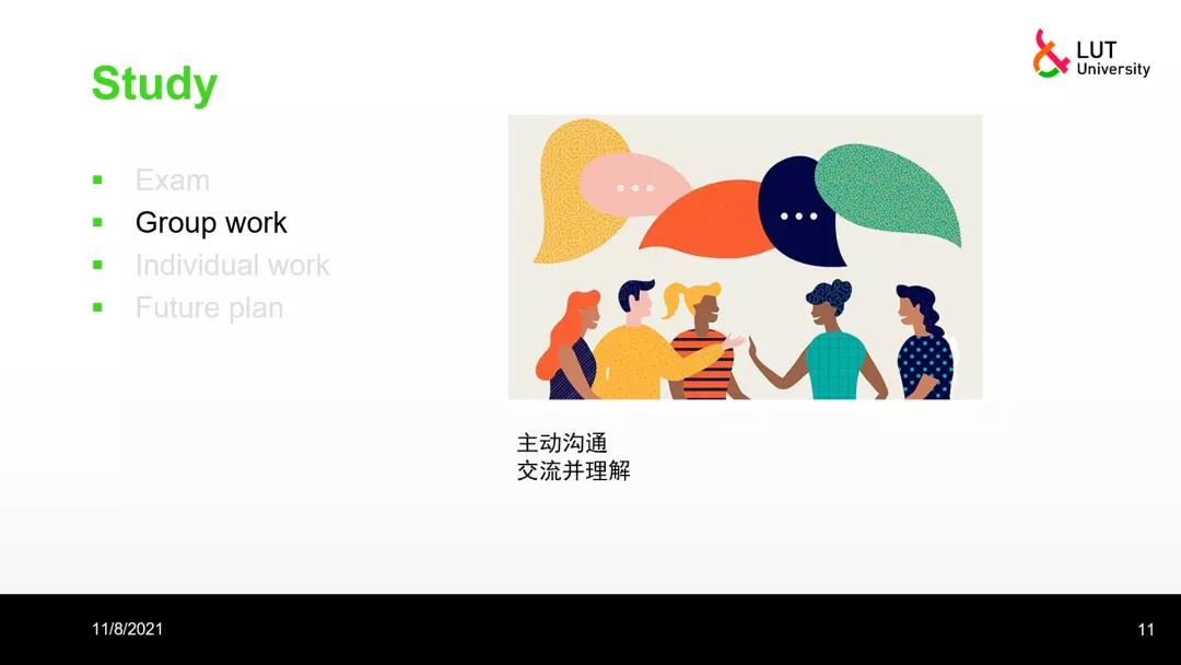 芬兰的学习模式与国内有很大不同,黎昌洋博士从考试考核、分组项目、个人工作、未来规划四个方面为同学们的学习提供了指导。在考试方面,为同学们介绍了开卷考试、电子考试和纸质考试三种考核方式,使同学们在准备考试的过程中更加得心应手;在分组项目方面,鼓励同学们积极与国际生沟通协作,取长补短;在个人工作方面,要求同学们合理分配时间精力,认真思考;在未来规划方面,在读研申请、假期工作、专业实习以及论文写作等方面给出了明确建议。