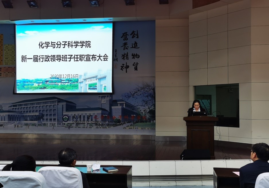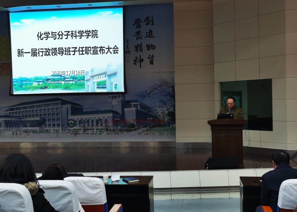 前任院长周翔代表上一届行政领导班子讲话,他对他任职以来的历届领导班子及学院全体教职工的努力和付出表示衷心感谢,并表达了对新一届领导班子的美好祝愿:大家一起为成为“国内一流、世界知名”的化学学科而努力奋斗。