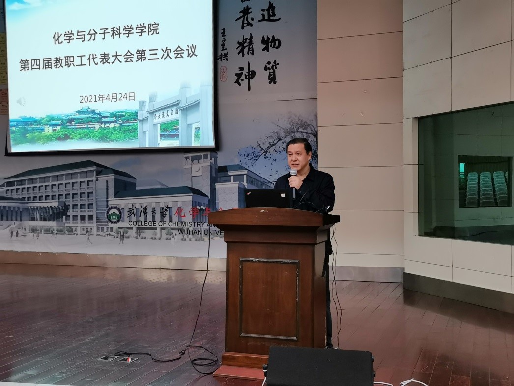 庄林院长作学院工作报告,首先回顾了“十三五”期间学院取得的成绩:学院以高质量发展为主线,在人才培养、教育教学、人才队伍建设方面成绩突出,学科排名上升,进步显著;他指出,当前学院还面临很多困难与不足,下一阶段将继续狠抓人才队伍建设、人才培养、学科建设、科研创新等工作;关于近期工作重点,他指出,要改组应用化学学科、建立化学工程技术转化中心,改革博士生导师制度,改革实验室收费管理制度并提升实验室安全管理等级。庄林院长强调,2021年是学院“十四五”发展规划实施的开局之年,学院将以此为契机,坚持立德树人,以深化改革为动力,以制度建设为依托,担当敢为,努力提升学院综合实力。