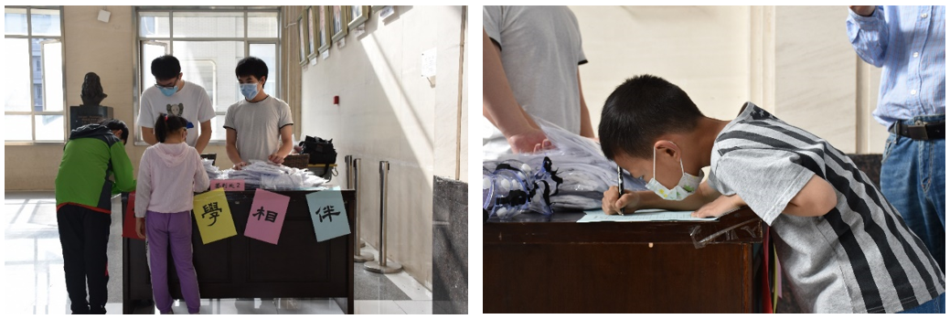 活动开始前,老师和孩子们先到化学院西楼大厅签到,领取防疫物资和实验所需护目镜、实验服。小朋友们郑重的在签到表上写下自己的名字,穿上实验服,贴好印有自己名字的贴纸,经测温后入会场,欢欣的等待讲座的开始。