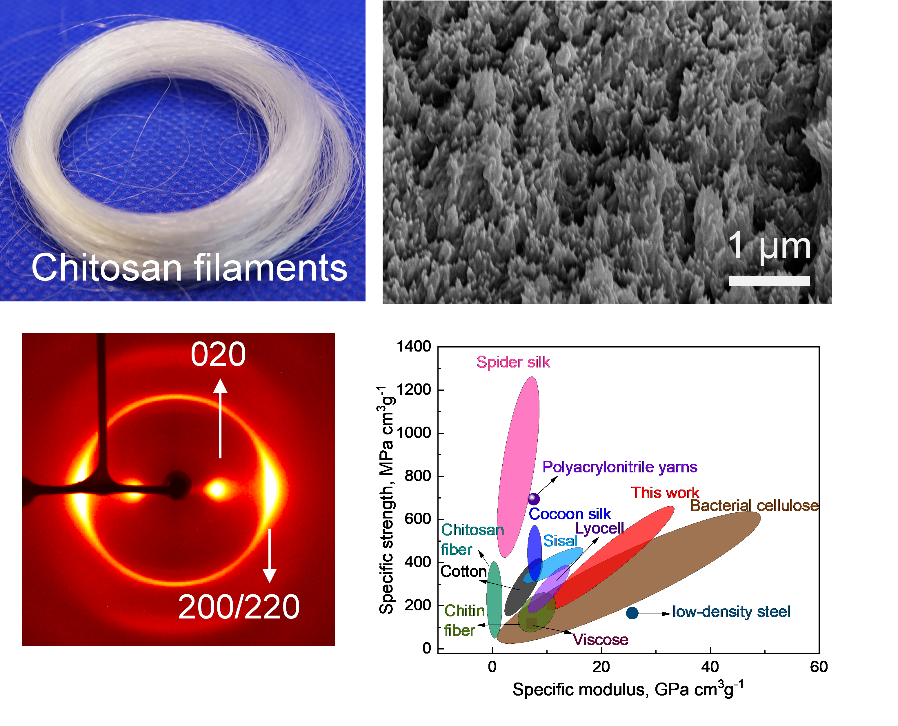 蔡杰课题组一直致力于天然高分子绿色新溶剂和新材料研究,实现了纤维素、甲壳素和壳聚糖在水溶剂体系中的高效快速溶解,构建出高性能和多功能天然高分子基环境友好材料和生物医用材料。在前期工作的基础上,他们开发了一种绿色湿法纺丝技术制备出超强、超硬的壳聚糖纤维。壳聚糖纤维具有高度有序的多级结构,拉伸强度和杨氏模量分别达到878 ± 123 MPa和44.7 ± 12.3 GPa,与蜘蛛丝和细菌纤维素性能相当。而且,壳聚糖纤维的比强度和比模量优于低密度钢。