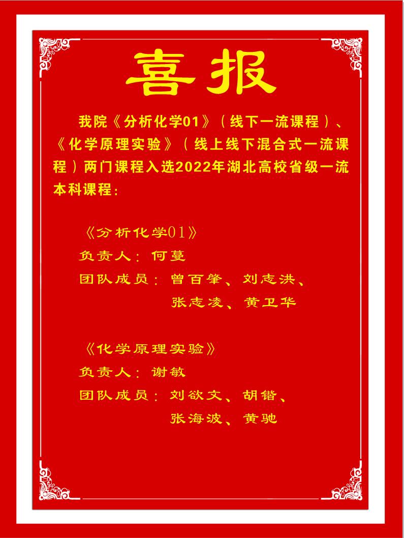 喜报┃骰宝 《分析化学01》、《化学原理实验》两门课程入选2022年度湖北省一流本科课程