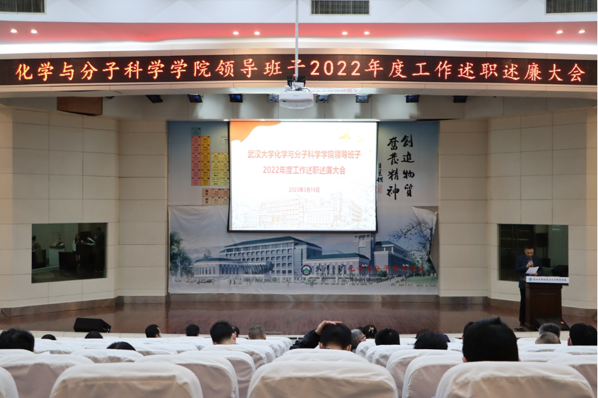在学院领导班子2022年度工作述职测评环节,党委书记王丽萍代表学院领导班子进行述职,她从坚定不移抓政治建设、扛牢全面从严治党责任、夯实组织建设基础、丰富文化建设载体、学院高质量内涵发展、深化拔尖人才培养、强化师资队伍建设、严守安全稳定底线等方面,报告了学院领导班子2022年度工作情况。她表示,2023年学院把学习宣传贯彻党的二十大精神作为最重要任务,探讨实现学院高质量发展的新路径、新举措,深入推进全面从严治党,继续深化研究生培养改革,创新拔尖创新人才培养,扎实推进化学学科130周年庆典,谱写学院发展新篇章。随后,班子成员个人采取书面形式述职,党委副书记何剑超作试用期满工作述职报告,学校党委组织部现场进行了民主测评。