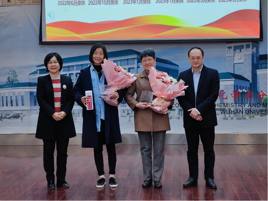 新入职教师欢迎仪式上,王丽萍和庄林为11位新入职教师送花祝贺。新入职老师们发表入职感言,纷纷表示非常荣幸成为化学学院的一员,将会努力工作为学院发展贡献力量。