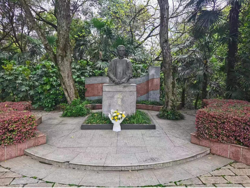 何剑超代表学院师生,手捧花束献放在王星拱雕像前。献花之后,全体成员三鞠躬行礼,整个过程中大家表情庄重,神情严肃。