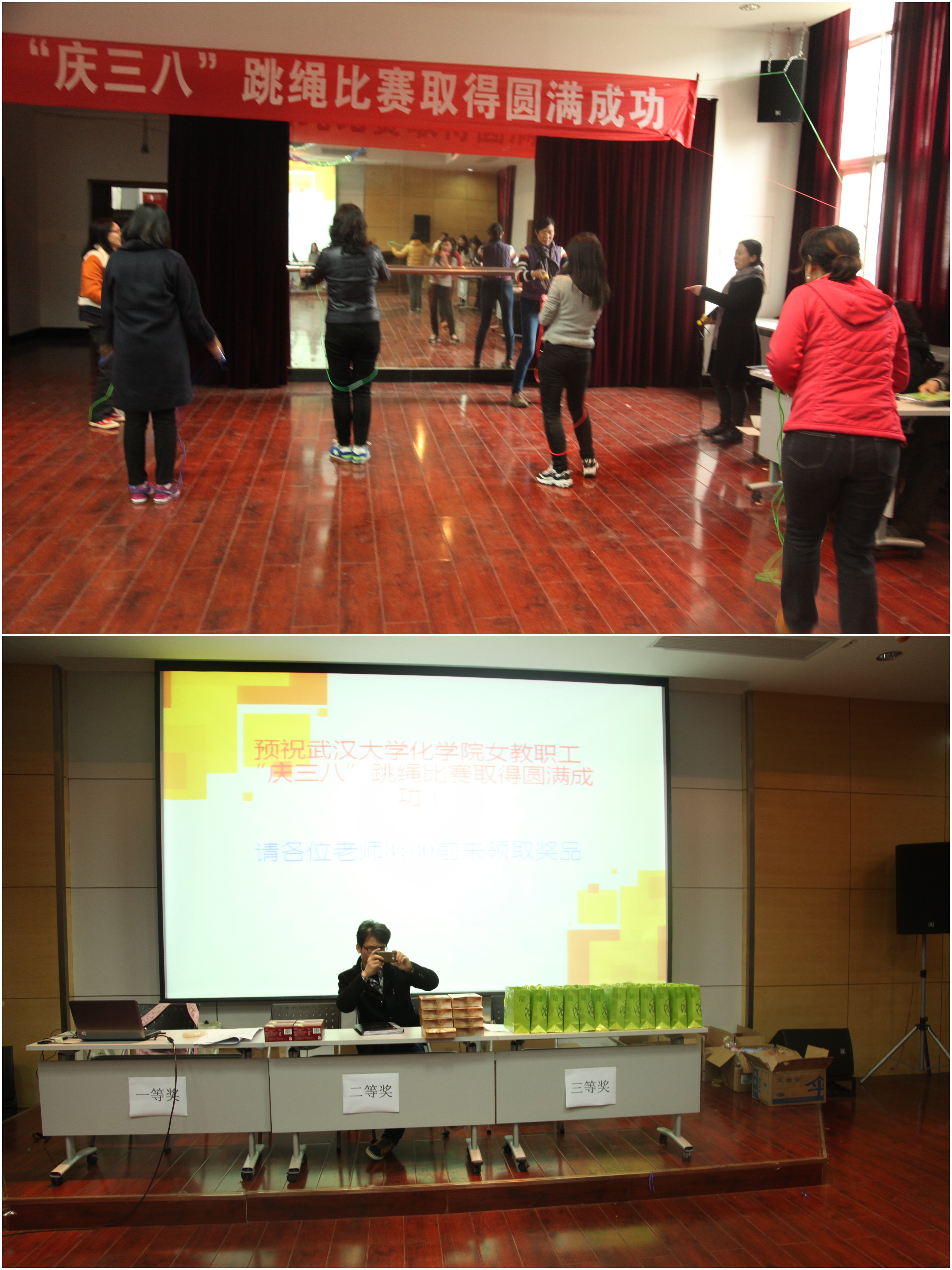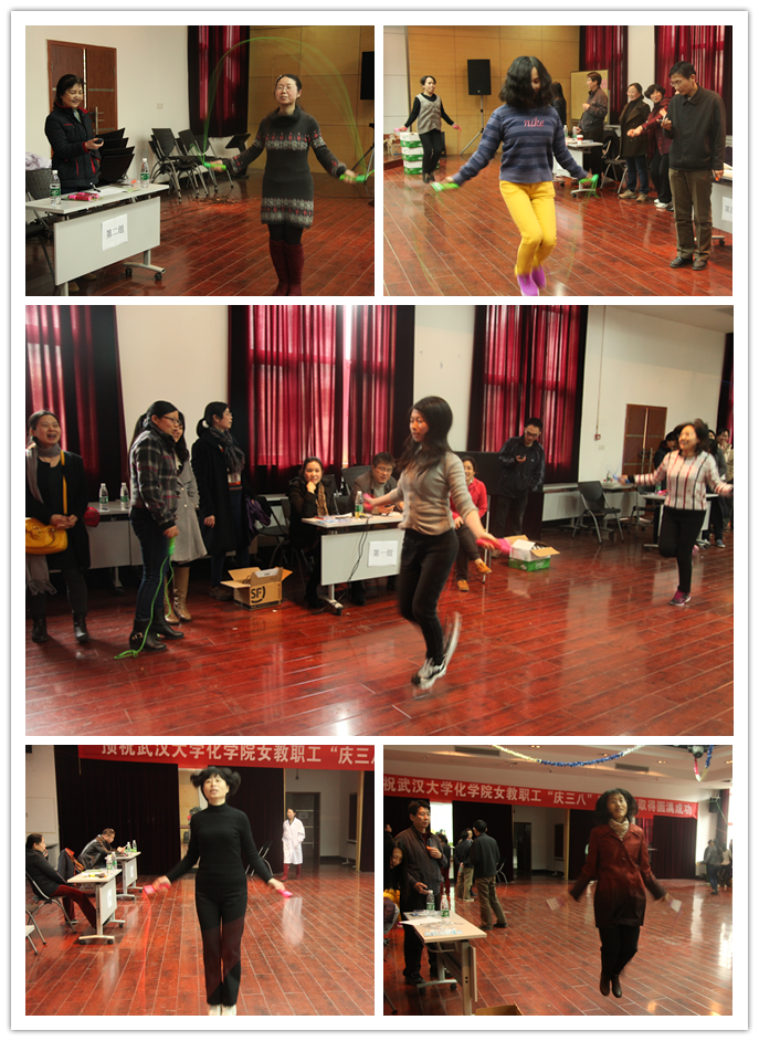 3月20日下午2点,化学院工会在教工之家举办了女职工“庆三八”跳绳比赛,全院所有二级单位的女教职工共计71名参与了这次比赛,学院的男教工,包括卢昌宁、秦后国和梅超华三位男领导,也纷纷充当后勤服务人员,各位二级工会小组长尽心尽力为本次比赛的成功举办做出了很大的贡献,本次比赛设置团体奖和个人奖两个奖项。