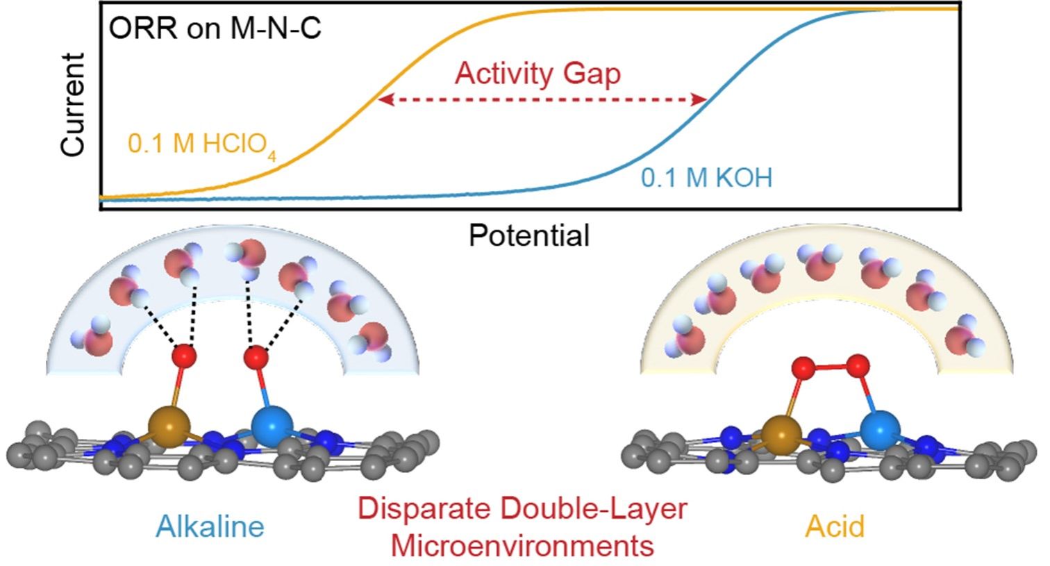 金属-氮-碳(M-N-C)催化剂是氧还原反应(ORR)铂基贵金属材料最有前途的替代品之一。近年来,人们致力于通过调节金属中心的局域配位环境、杂原子掺杂调整电子结构等策略来提高M-N-C催化剂的ORR电催化性能、稳定性和选择性。尽管材料开发取得了巨大进展,但关于M-N-C催化ORR的微观机制仍存在若干疑惑。比如,为什么当电解质pH从碱性变为酸性时M-N-C催化剂的氧还原活性会急剧下降。这不仅是当前电化学的一个基础难题,而且严重阻碍了质子交换膜燃料电池低成本M-N-C催化剂的发展。