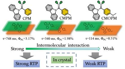 磷光是一种长寿命的发光现象,室温磷光通常可以在无机化合物中观察到(如夜明珠)。传统观念认为对有机化合物而言,磷光只能在低温下获得。这是由于:一方面,在有机化合物中激子处于高度的局域化,并且非常容易复合,对于磷光这种长寿命过程非常不利;另一方面,磷光的产生需要克服分子本身的自旋禁阻与无辐射跃迁的限制。然而,近几年的研究表明可以通过在有机分子中引入醛基、羰基、卤原子等增强自旋轨道耦合效应,或者采用结晶、刚性基质、氘取代等方法抑制无辐射跃迁,得到寿命可达秒级的室温磷光。但是对于固态下分子的堆积方式对其磷光的影响仍然缺少清晰的认识。