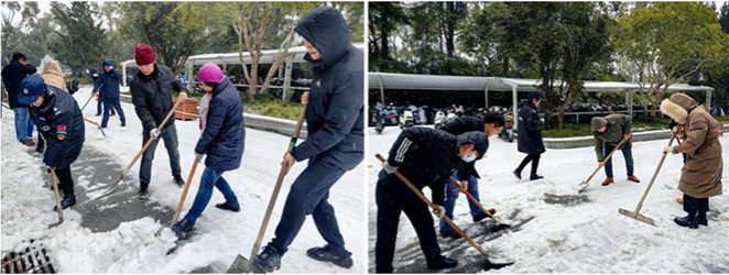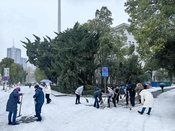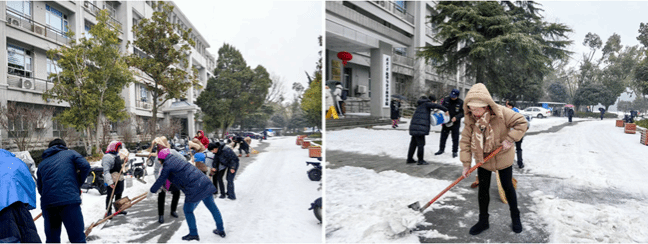 2月22日,新学期开学第一天,经一夜雪和霰,校园内银装素裹,却给出行带来不便。为保障师生出行安全,在学院领导带领下,机关办公室和物业合力清理学院东门和西门道路,大家不惧严寒风雪,干劲十足,铲雪除冰,暖心迎开学。
