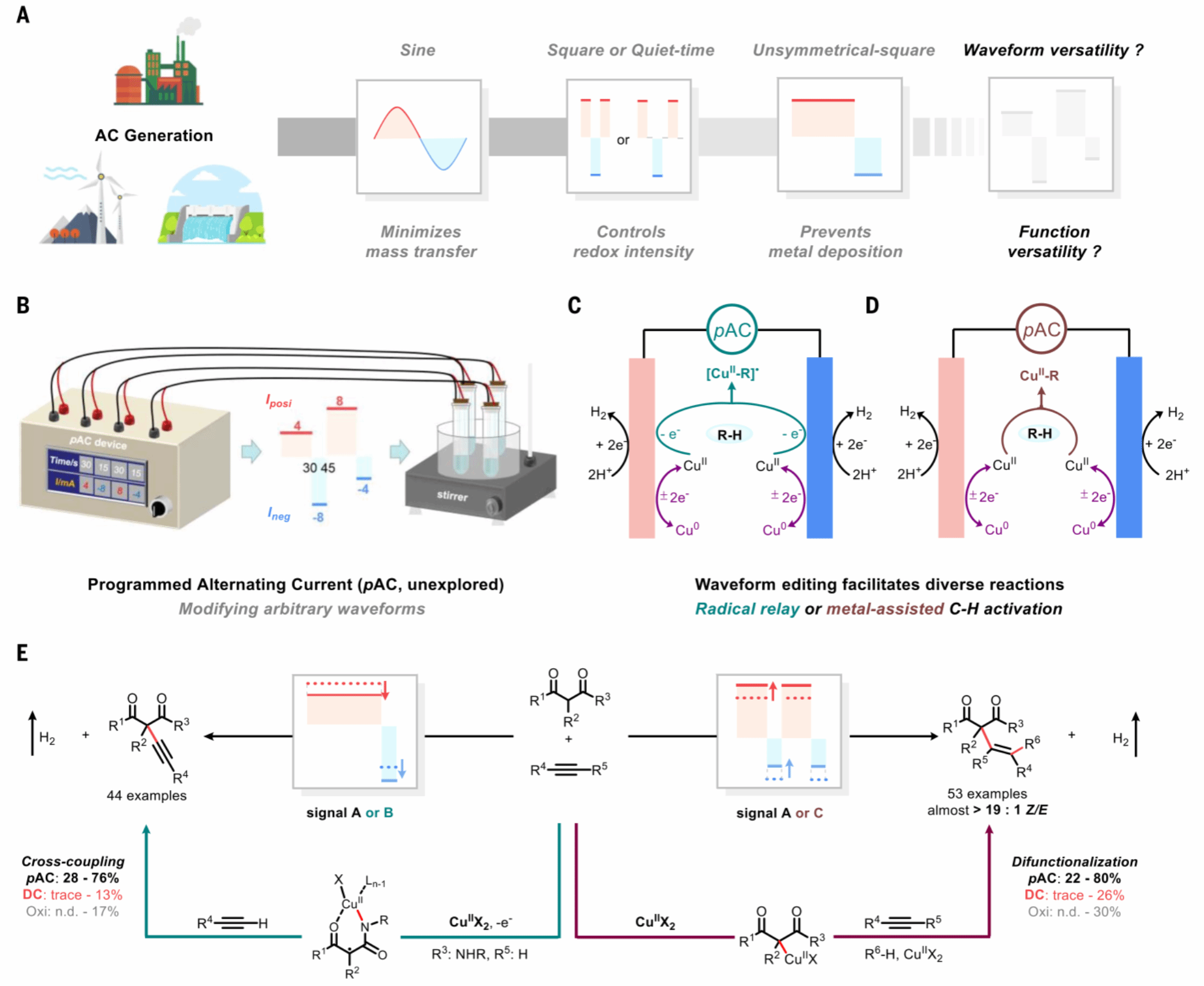 本项研究首创开发了可编程波形交流电(pAC)合成技术,实现了铜催化的放氢气氧化交叉偶联反应。通过对交流电波形的电学参数(频率、电流和占空比)进行程序编辑可得到定制化的交流电信号。不同编辑模式的电信号不仅促进了电解条件下铜催化剂循环再生,而且分别精准调控铜催化剂形成“铜结合碳自由基物种”和“碳-铜活性物种”。另外,雷爱文教授团队开发了原位电子顺磁共振波谱-交流电解联用表征技术,首次观测到不同交流电信号动态调控铜催化物种活性的变化规律。基于可编程交流电合成技术,研究团队成功实现了铜催化活化烷烃直接碳氢键氧化偶联反应和氧化双官能团化反应,而这两类反应在传统氧化剂条件和直流电氧化条件下均表现出较差的反应性。