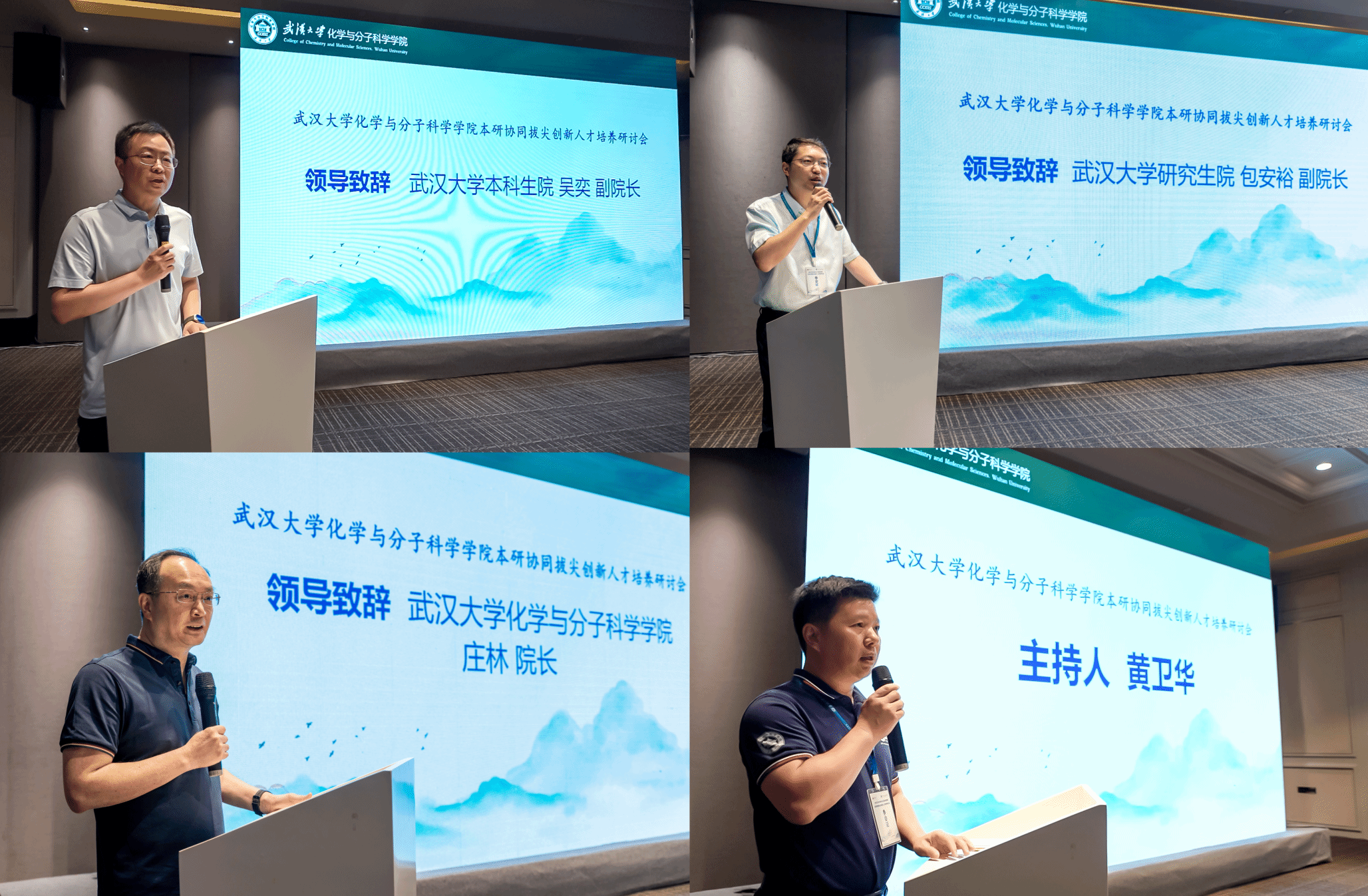 于2024年8月24日召开本研协同拔尖创新人才培养研讨会。清华大学化学系主任刘磊教授、北京大学化学与分子工程学院副院长甘良兵教授、中国科学技术大学化学与材料科学学院江俊教授、学校本科生院副院长吴奕、研究生院副院长包安裕、弘毅学堂党委书记李振教授、人事部部长付磊教授、科学技术发展研究院副院长袁荃教授、发展规划与学科建设办公室副主任周强辉教授、学院党委书记黄卫华教授、院长庄林教授出席会议。参加会议的还有学院领导班子成员、鲲鹏班咨询/执行委员会委员、本科教学指导委员会委员、拔尖班班级导师、鲲鹏班导师及拔尖学生代表等。