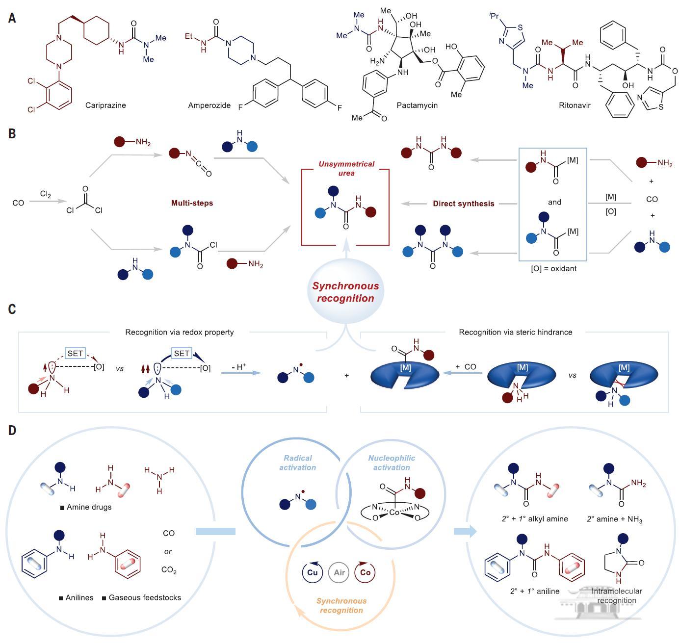 雷爱文课题组耕耘机理研究近二十载,该研究提出了同步精准识别策略,结合不同胺与不同金属的反应性识别两种胺的本征属性,使得多种胺能在氧化羰基化中高选择性偶联,解决了同一催化体系中相似属性的胺难以区分的关键问题。课题组通过原位同步辐射技术及电子顺磁共振波谱研究了铜催化剂与一级和二级胺之间的单电子转移动力学,揭示了铜催化剂与二级胺之间的高效电子转移,并通过位阻效应发现了钴催化剂与一级胺的匹配规律。因而,课题组成功实现了氧化羰基化中,在同一催化体系和时空尺度下,以高选择性合成近40种非对称脲类药物衍生物,显示出该方法在药物合成中的巨大潜力。