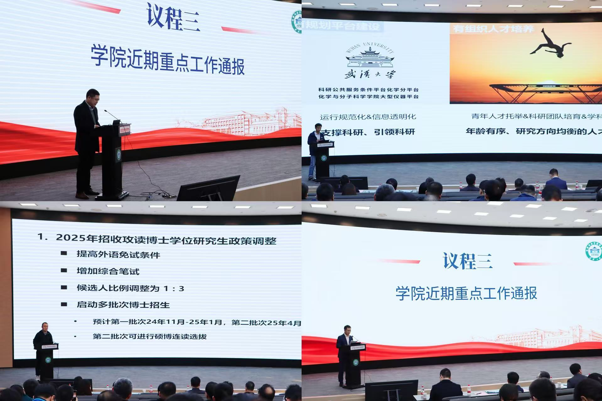 翁小成副院长介绍了研究生招生和培养情况。他指出,2025年招收攻读博士学位研究生的政策发生了调整,这与教育部深入推进学术学位与专业学位研究生教育分类发展的意见相符合,旨在提高拔尖创新人才自主培养质量。同时,要关注研究生分类培养的新政策、新方向,包括优化考核形式,综合评价考生的考试成绩、专业素养、实践能力、创新精神和一贯学业表现等,以实现择优录取,不断提高人才培养质量。