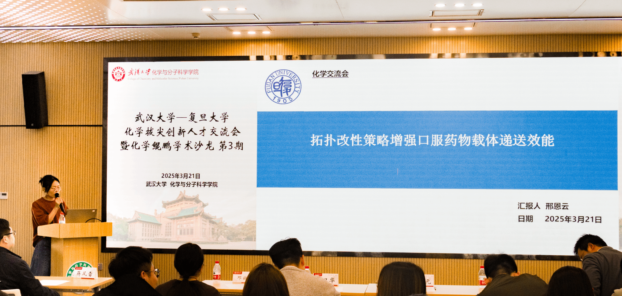 交流会设置了12个口头报告和30个墙报,涵盖合成化学、能源材料、生物医药等多个前沿领域。口头报告环节中,两校优秀博士生代表围绕共价有机框架材料的设计与应用、新型电池技术的开发、纳米材料在疾病治疗中的创新应用等主题展开深入交流探讨。墙报展示区汇集了30项创新研究成果,聚焦介孔材料精准合成、电化学催化机制解析、生物传感技术开发等热点方向。