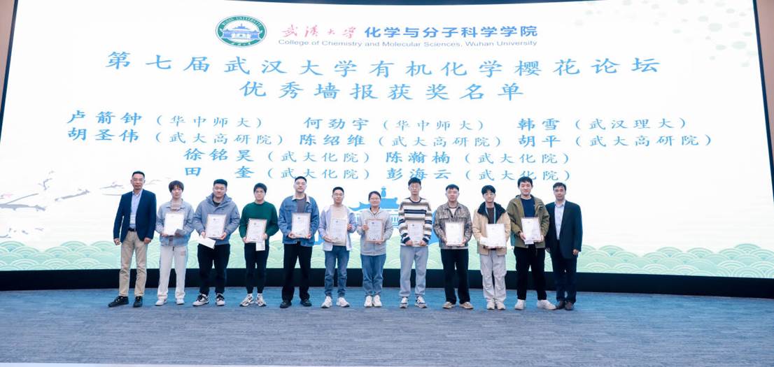本次论坛首次增设了快闪报告环节。华中师范大学徐浩教授介绍了铜催化远程不对称控制反应,实现手性炔丙基衍生物的合成;华中农业大学滕怀龙教授介绍了基于靶向农药分子设计策略,开发出一系列新型抑菌先导药物分子;武汉理工大学黄毅勇教授介绍了有机合成材料在极端环境中的应用;湖北大学刘悦进教授介绍了基于超强膦配位策略对钌催化C-H键活化的研究;北京大学余志祥教授介绍了铑催化的[5+1+2]反应为合成多官能化的八元环化合物提供新的途径。