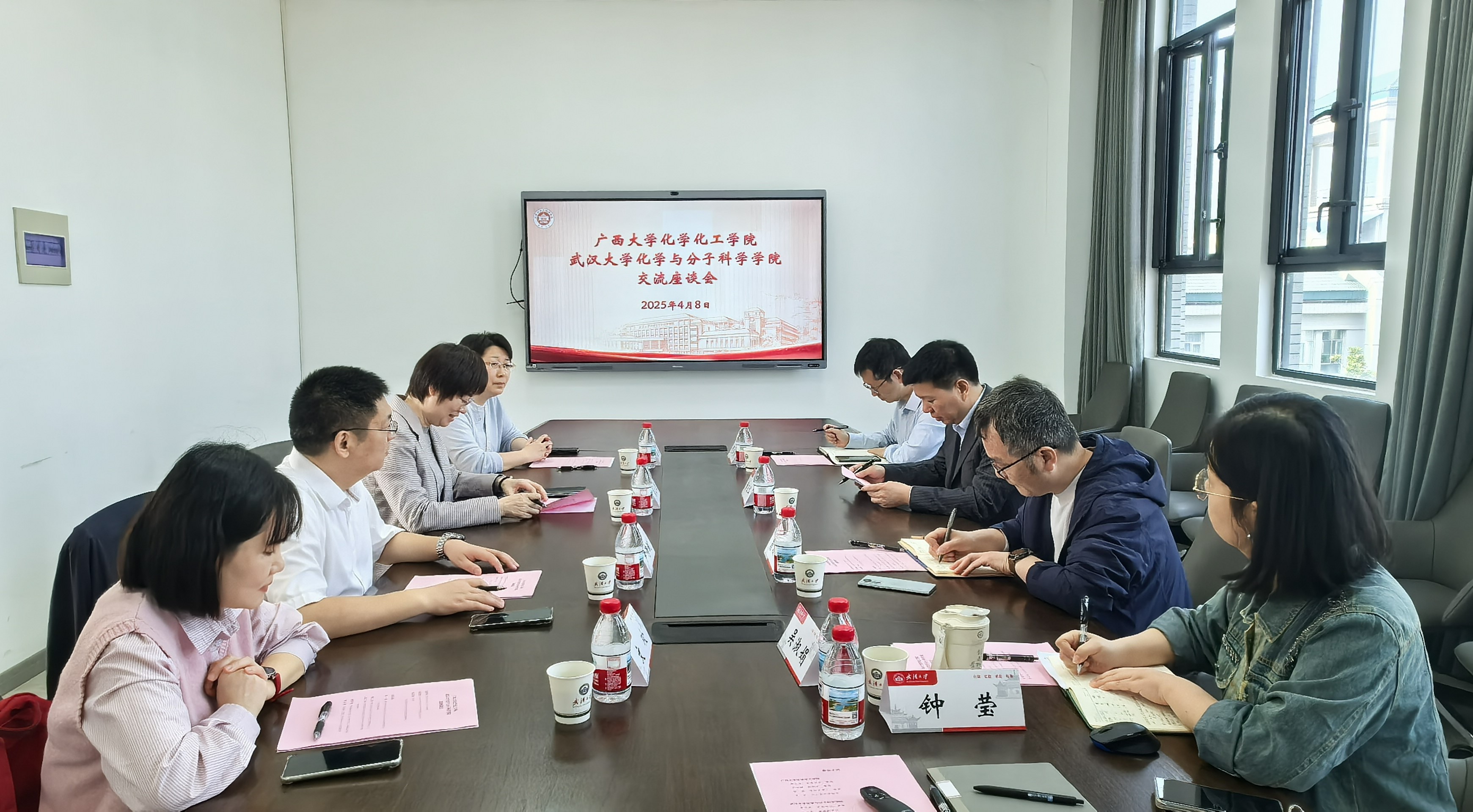 翁小成介绍武大化学院学科布局、科研平台、人才培养等情况。尹诗斌围绕广西大学化学院区位优势,介绍资源化工等特色研究方向及服务广西工业发展的产学研成果。交流环节,双方就党建引领、学科建设、人才队伍建设等三大议题深入探讨。