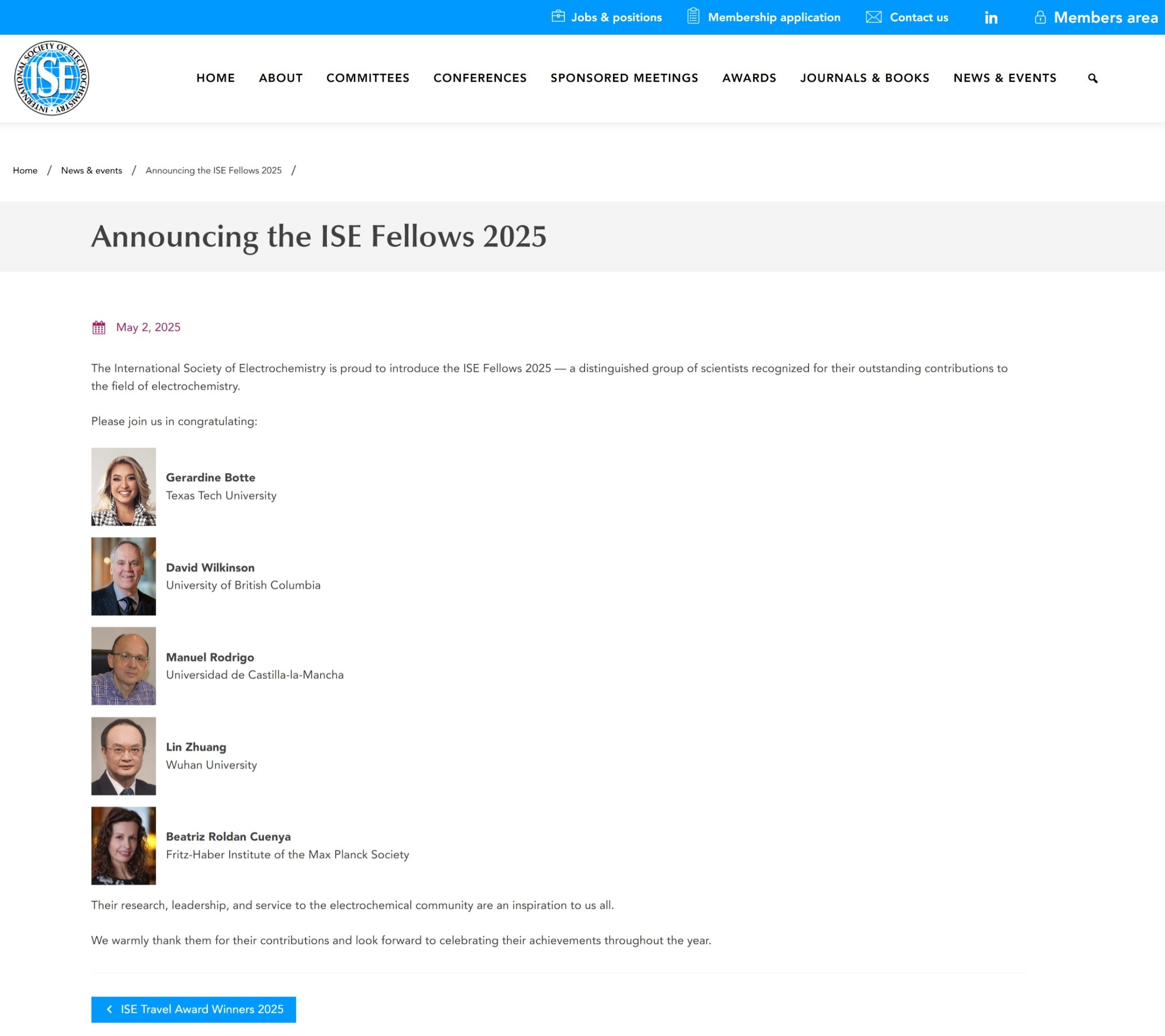 国际电化学会成立于1949年,是全球电化学领域最具影响力的学术组织之一。ISE会士是该学会授予会员的最高荣誉,旨在表彰在电化学领域做出卓越且持续性贡献的顶尖科学家。该奖项评选流程极为严格,每年新增会士数量稀少,代表着国际电化学研究的前沿水平与卓越成就。