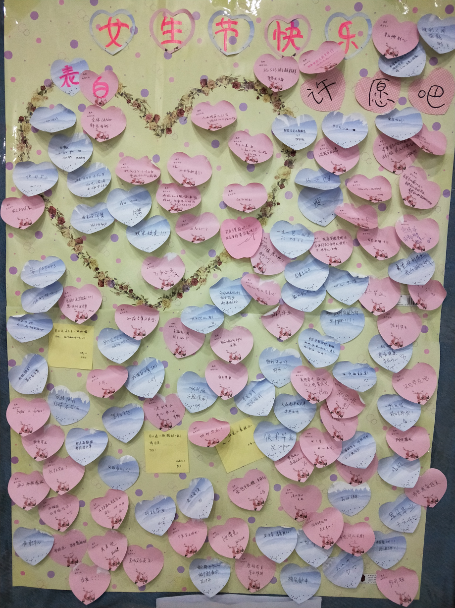 活动还未开始,女生部成员就已早早来到化院东门设置摆点,为大家摆好心愿墙,准备节日礼物和便签。十一点活动正式开始,同学们积极参与,耐心排队,现场次序井然有序。女生们满带笑容地写下自己的心愿,随后领取工作人员为大家分发的玫瑰和酸奶,男同学则兴奋地写下自己的表白便签。得知自己的便签将由工作人员亲自派送至表白对象的手中,不少男生露出羞涩的笑容。活动现场到处弥漫着青春快乐的气息,化东门口一时充满了温馨与欢乐。