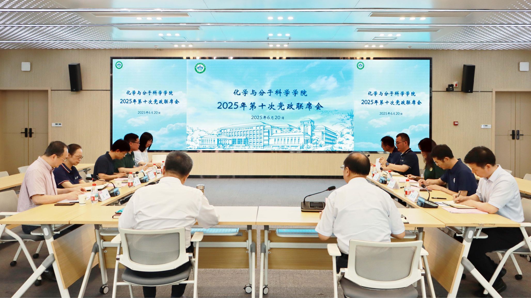 接着学院领导依次通报近期开展的主要工作。党委书记黄卫华汇报了学院教师岗位分系列管理工作进展,包括前期调研情况、师资队伍现状、目前建设存在的问题、人才培育机制创新的探索及下一步工作思路,力争“十五五”期间建成与世界一流化学学科相称的高水平师资队伍;副院长翁小成以“六线联动、质量提升”为主题通报研究生招生宣讲工作,学院精选6条路线,覆盖22所潜在优质生源高校,着力彰显培养特色优势,灵活组织面试,发放菁英人才卡和营员资格证,提前锁定优质生源,多措并举提升生源质量;副院长蒋风雷介绍了新能源自强班暑期学习安排,学院坚持三方共建、科教融汇的理念,构建进阶式多层次科研训练体系,学生培养实现从知识积累、能力提高到素养提升的跃变。副院长刘文博汇报小米数智化学实验室建设思路,详细介绍了实验室的选址、设计理念和建设规划,提出要打造数智化学新型人才培养基地,构筑化学人才培养的“武大模式”。