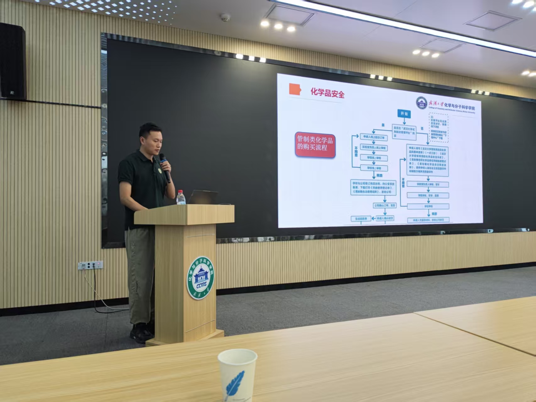 安全与实验室管理办公室陈雨平对全体实验室安全员开展了系统性的安全知识培训,围绕化学品安全、安全检查要点、行为规范及其它安全注意事项等内容,借助流程图与实例进行了详细讲解,并特别强调切实落实好实验室值日制度的重要性。