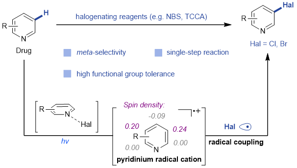 在此背景下,该团队使用常用的亲电卤化试剂(NBS、TCCA),利用可见光诱导产生活性吡啶自由基阳离子中间体,与体系中产生的卤素自由基以自由基偶联的方式高区域选择性生成间位卤化产物。反应的活性和选择性由吡啶自由基阳离子的自旋密度分布与潜在的π-π堆积调控,这在以往研究中从未报道过。该反应条件温和,可以在空气氛围中进行,具有良好的底物普适性,并能应用于复杂药物分子的后期官能化修饰。