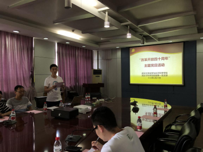 高分子科学实验室第一党支部在化北508组织开展了以“改革开放四十周年——崛起的中国”为主题的党日活动。出席会议的有学院党委书记卢昌宁,党委副书记徐冶琼,研究生辅导员姬建建,研究生兼职辅导员张明康、余晓敏以及高分子第一党支部全体党员和各研究生党支部书记。会议由该党支部书记、博士生张明康主持。