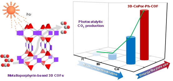 光催化CO2还原技术利用太阳能将二氧化碳转化为燃料和高附加值化学品,不仅是人工光合作用研究的核心内容,也被认为是实现碳中和目标的重要途径之一。然而,该技术目前仍面临诸多挑战,亟需开发高效新型光催化剂。共价有机框架(COF)是一种新型晶态有机多孔材料,具有结构可调、孔隙率高和稳定性优异等特点,在光催化CO2还原领域展现出巨大潜力。其中,三维COF具有较高比表面积、贯通孔道结构和丰富开放活性位点,是进一步提升光催化CO2还原性能并揭示构效关系的理想模型催化剂。但由于三维COF合成和结构表征面临挑战,其孔道环境(如催化中心和孔径)对光催化性能的影响,尚未有系统研究。