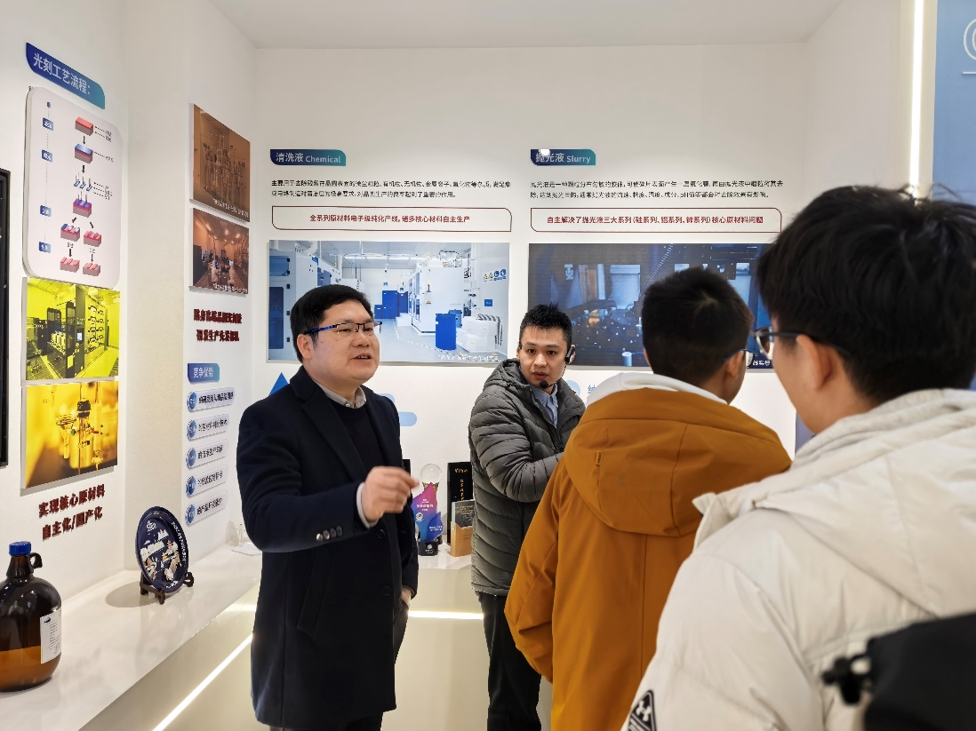 1月16日上午,学院副院长蒋风雷、学工办主任蒋莉、副主任杨子豪带队参观了湖北鼎龙控股股份有限公司。企业相关负责人详细介绍了公司从打印机耗材起步,逐步发展成为在湖北、长三角、珠三角广泛布局,专注于半导体材料、光电显示材料等高端领域的创新历程。同学们深入了解了晶圆加工、封装等技术,并通过抛光垫等实物模型,直观感受到纳米级精度抛光工艺的技术魅力。在参观环节,同学们透过车间观察窗,看到了高度自动化的生产线——仅需初始投料,后续流程均由智能化系统完成。研发实验室里技术人员专注工作的场景,也让同学们感受到了企业浓厚的创新氛围。