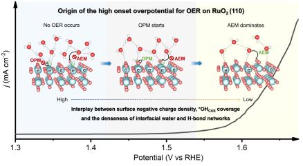该团队结合AIMD模拟和增强自由能采样方法,在保持“电极电势-表面吸附相-界面双电层结构”自洽、且接近真实电化学体系的条件下,系统探究了OER相关的1.23 V至1.80 V电位范围内RuO2(110)表面上电势依赖的稳定氧化表面相、界面水和氢键网络环境、反应路径以及基元步骤的热力学和动力学。结果表明,RuO2上高OER起始过电位主要是由两个因素共同导致的:一是在OER电势条件下,氧化物电极表面由于其异常高的零电荷电势(PZC)而呈现显著的负电荷特性;二是低反应电位(<1.60 V)下,配位不饱和Ru位点上表面活性*O物种存在过度质子化。这一方面使得表面活性*O物种密度降低,从而抑制氧化物路径机制(OPM)的速率决定步,即遵循Langmuir-Hinshelwood机制的表面*O-*O偶联。另一方面,其会诱导形成致密且强氢键作用的界面水层,其与静电斥力共同作用阻碍了吸附物演化机制(AEM)的速率决定步,即类似Eley-Rideal机制的界面水分子重定向并与表面活性*O成键。这些发现为理解复杂OER体系提供了新的见解,也可为突破OER活性—稳定性权衡提供思路与基础指导。