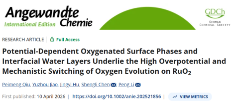陈胜利教授、李朋副研究员团队的最新研究成果。该研究以RuO2电极为模型体系,在原子尺度上对酸性氧析出(OER)电催化的表、界面化学及其长久以来的高过电位难题开展了系统性解析。论文题为“Potential-Dependent Oxygenated Surface Phases and Interfacial Water Layers Underlie the High Overpotential and Mechanistic Switching of Oxygen Evolution on RuO2”。博士研究生邱沛萌为论文第一作者,李朋副研究员和陈胜利教授为共同通讯作者。