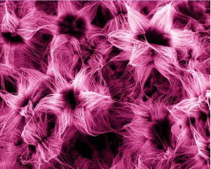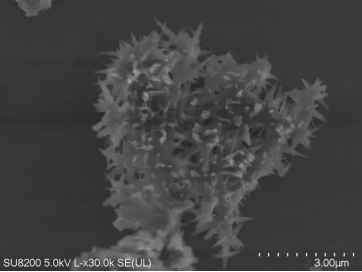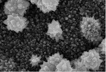 5、几颗细小的种子,经历一段水与火的艰难成长,终绽放成绚烂的花朵,扎根于细小石砾间,纵然根浅,相依相偎,借由电子的洞察,将尘中之花献与世间。这是一幅意外得到的电镜照片,过量的生长液阻碍了纳米线形成,在不均匀的位点快速生长团聚而形成了类似莲花的纳米花形状,而更多的晶种则停止生长,维持较小的颗粒,仿佛供给花开养料的土壤。虽是失败的实验,却是美丽的奇迹。秦羽同学带来的21号作品“晶莲”,最终获得了433票。