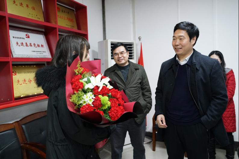 在学院党员活动室里,校党委副书记沈壮海高度表扬了吴雅珣见义勇为的举动和机智妥当的处置,亲切地问候她学习、生活情况,并表达了美好祝愿。