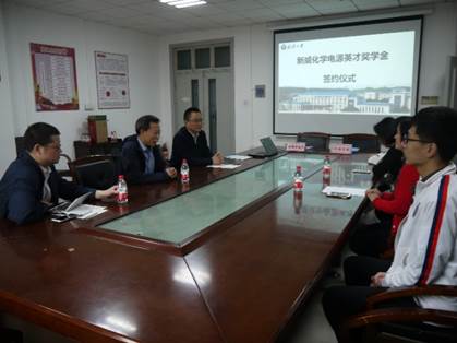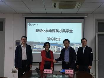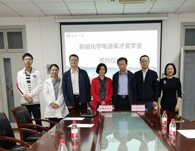 化学学院和新威尔电子有限公司签订了“新威尔化学电源英才奖学金”捐赠协议,并进行合影留念,签约仪式圆满完成。