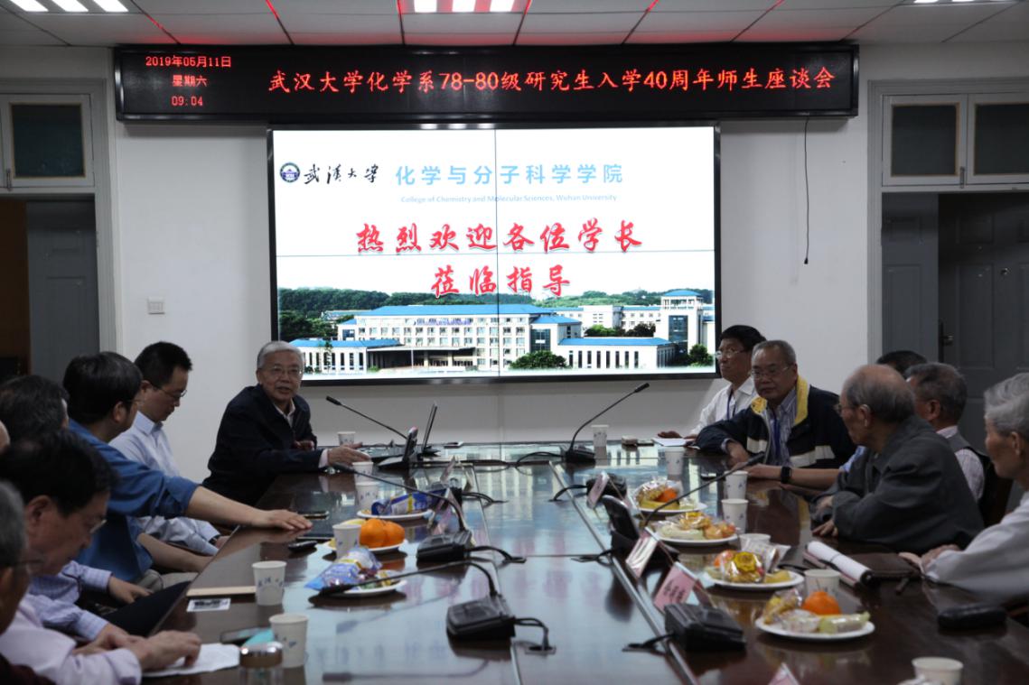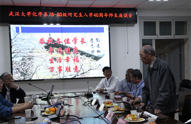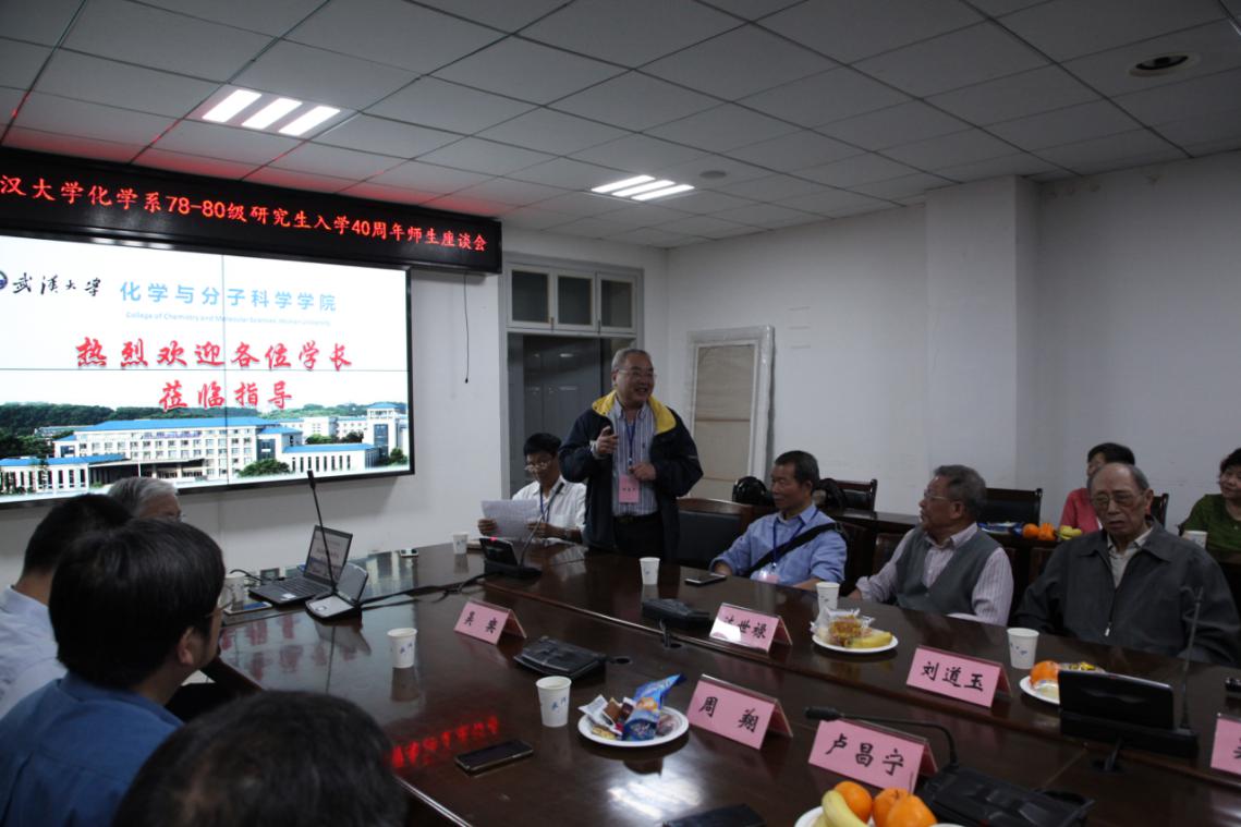 11日上午,校友们在学院会议室举行了师生座谈会。参加此次聚会座谈的还有学院卢昌宁书记、周翔院长、吴奕副书记,以及刘道玉老校长、徐羽梧、吴萱阶、达世禄、陆君涛等教师代表。座谈会由78级有机化学研究生、化学系更名为学院以后的第一任院长秦金贵教授主持。