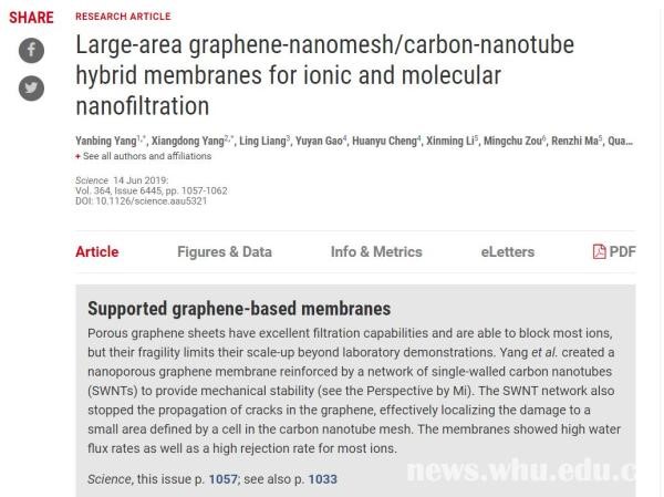 (转自武大新闻网)(通讯员化苑)6月14日, Science (《科学》)在线发表了我校在纳米孔过滤薄膜领域的最新研究成果。