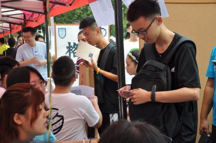 8月23日,新生正式报道。早上五点半,迎新工作人员梅场就位。七点半,报到工作正式开始。来自五湖四海的新生在报到处提交材料、登记报到、领取校园卡和院学生会精心准备的新生大礼包。每个环节都有工作人员具体负责,整个报到流程进行得迅速且有序。此外,学院还安派了专人在梅操附近的岔路口引导,以及带领初入校园的新生和家长到达宿舍办理入住手续。从早上五点半到下午五点,迎新工作人员接近十二个小时的守候,只为一句:欢迎到珈。