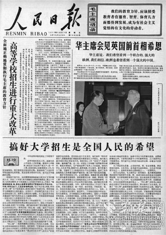 此时此刻,我们不能忘记,42年前,一位来自湖北的大学教授的倡议,促成邓小平当场拍板,才使得中断11年之久的高考重新恢复,由此改变了几代青年的命运,开启了梦想的时代,照亮了中国的前程。