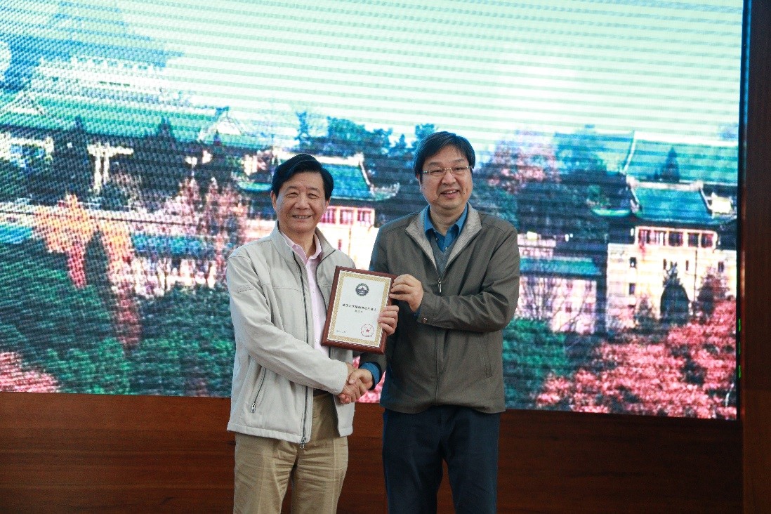 图为周翔院长为林国强院士颁发“珞珈讲坛”纪念牌