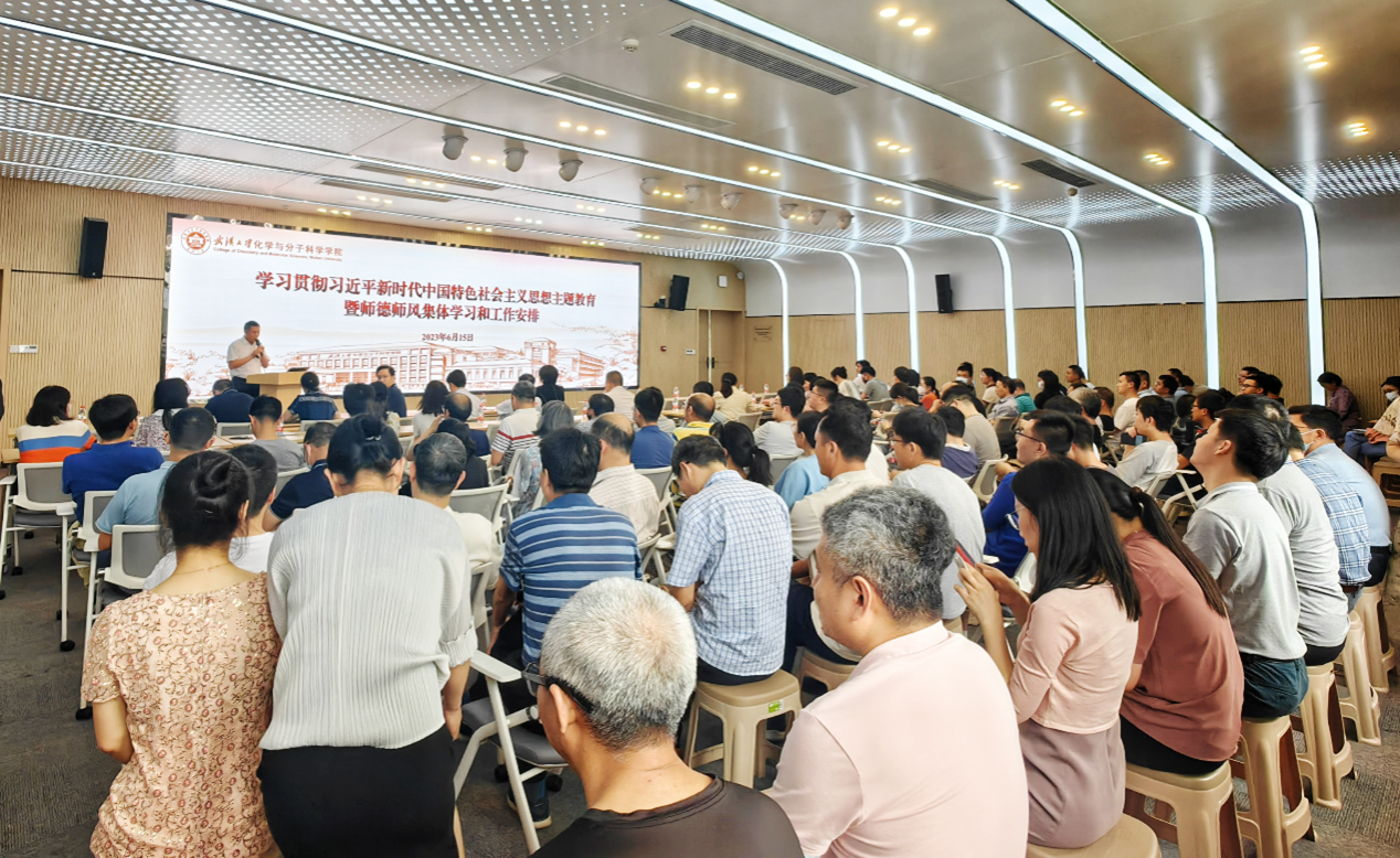 为进一步推进学习贯彻习近平新时代中国特色社会主义思想主题教育走深走实,并持续加强师德师风建设,6月15日下午,学院在曾昭抡报告厅召开全体教职工大会,集中开展主题教育和师德师风专题学习。会上还就武大化学130周年庆典、研究生教育综合改革、学院安全管理等近期重点工作进行了情况通报和工作部署。学院党政领导班子成员及全体教职工参加会议,党委副书记王中全主持会议。