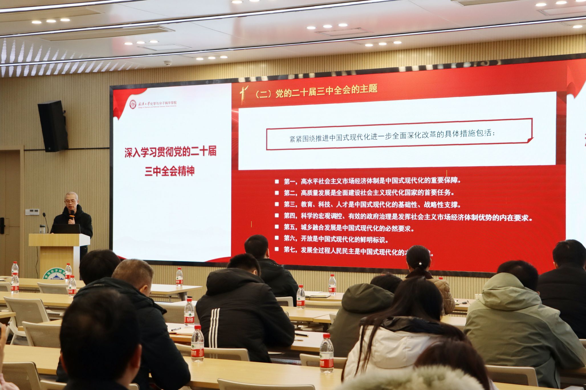 为深入学习领会习近平总书记关于全面深化改革的一系列新思想、新观点、新论断,全面贯彻落实党的二十届三中全会作出的重大决策部署,12 月 16 日上午十点,学院于曾昭抡学术报告厅开展深入学习贯彻党的二十届三中全会精神专题辅导报告会,旨在将全会精神融入教育教学实践,推动学院高质量发展。此次活动由马克思主义学院孔凡义教授主讲,学院党委书记黄卫华,副院长甘泉、翁小成、蒋风雷,全体教职工到场参加学习。学院党委副书记何剑超主持会议。