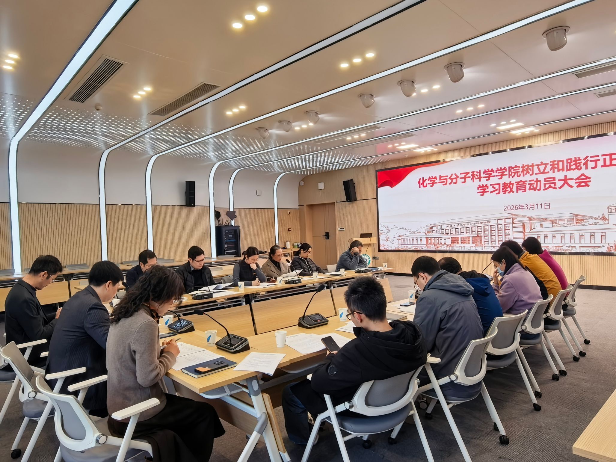 党委书记黄卫华作动员讲话,深刻阐释此次学习教育的政治、现实和实践意义,结合学院学科建设、人才培养等实际提出具体要求。他指出,树立和践行正确政绩观是贯彻党的二十届四中全会精神、推动学院高质量发展的必然要求,全院党员干部要紧扣既定总要求,将校内巡视整改与本次学习教育深度融合、一体推进。他强调,要深化理论学习并结合学科特色研究阐释;坚持问题导向,聚焦重点领域查摆整改、立行立改;注重成果转化,围绕教学科研等办实事;健全长效机制,压实责任,将政绩观建设纳入考核评价体系,坚持开门教育。各党支部采取“三会一课”、主题党日当方式,对学习教育做好安排。全院要以此次学习教育为契机,以实干作风把学习成效转化为学院“双一流”建设和“十五五”开局的实际动力,为学校建设中国特色世界一流大学贡献化学力量。