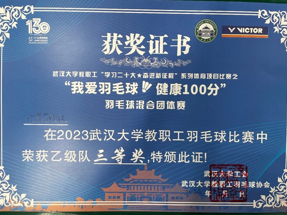 积极组建一支实力强劲、朝气蓬勃的教职工羽毛球队,经过两个周末的激烈角逐,化学院教职工羽毛球队在乙组36支队伍当中脱颖而出,获得乙级队三等奖的优异成绩。