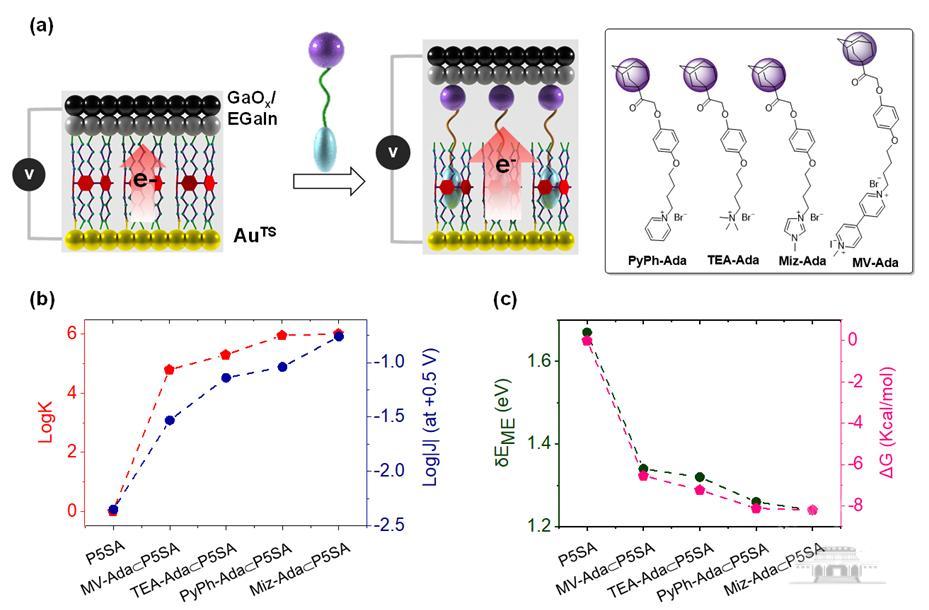 图4. (a) 客体MV-Ada, TEA-Ada,PyPh-Ada和miza–ada的基于主体P5SA的复合物的电荷传输和主-客体相互作用的关系。(b)由等温滴定量热法(ITC)得到的结合常数(Kapp, M-1)和来自+0.5 V偏压下电流密度值的趋势比较;(c)固相SAMs中分子-电极能级差(δEME)和溶液中主客体复合物吉布斯自由能 (ΔG)的趋势比较。