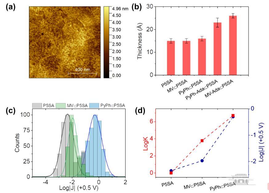图2. P5SA和P5SA主-客体复合物自组装单层膜的电荷传输性质 (a) P5SA单层膜的AFM形貌图;(b) P5SA、MV@P5SA、PyPh@P5SA、PyPh- ada@P5SA、MV- ada@P5SA的单层膜厚度。(c) +0.5 V偏压下P5SA、MV@P5SA、PyPh@P5SA分子器件电流密度(|J|)的归一化直方图 (Gaussian拟合)。(d) +0.5 V偏压下基于AuTS/P5SA的SAM//GaOx/EGaIn器件测定的log|J|曲线和ITC测定的主客体复合物的logK曲线。