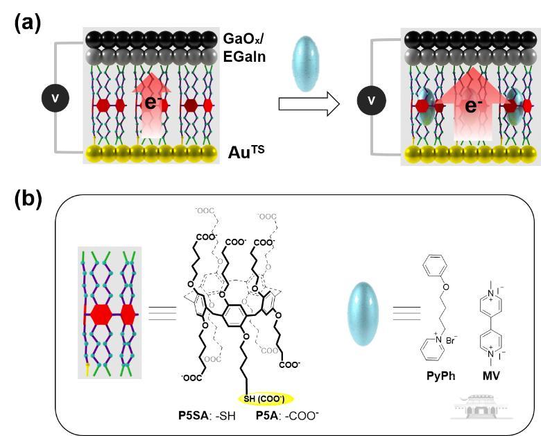 图1. P5SA、MV@P5SA和PyPhe@P5SA超分子电子学测试示意图 (a)Au底部电极、SAMs和GaOx/EGaIn顶部电极组成的分子器件示意图;(b) 主体分子(P5A和P5SA)和客体分子(PyPh和MV)的结构图。