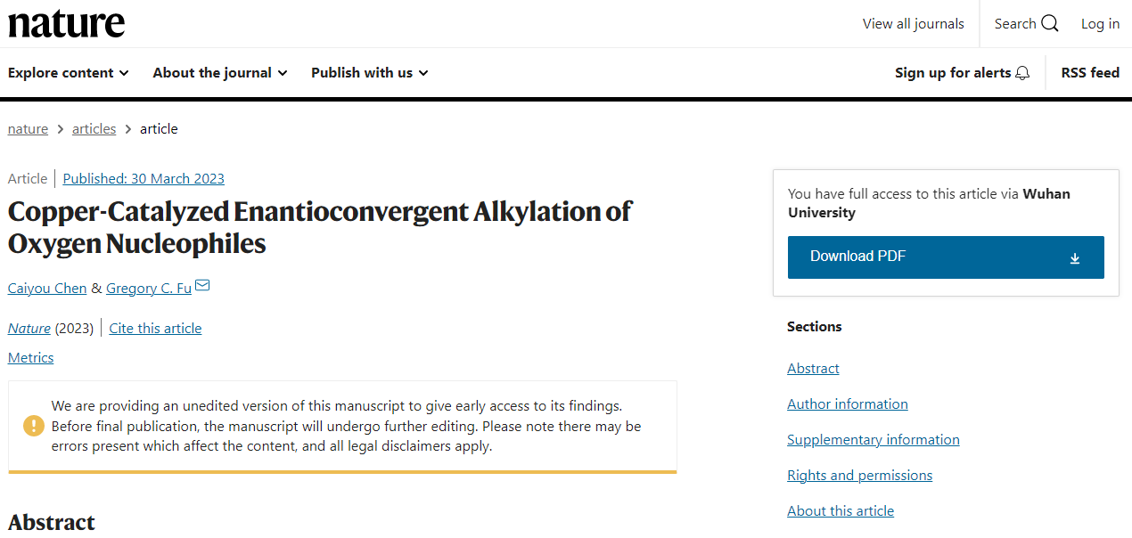陈才友教授的研究成果“铜催化氧亲核试剂的立体汇聚烷基化”(10.1038/s41586-023-06001-y)。文章题目为“Copper-Catalyzed Enantioconvergent Alkylation of Oxygen Nucleophiles”,美国科学院院士Gregory C. Fu为通讯作者,陈才友教授是除通讯作者外的唯一作者。