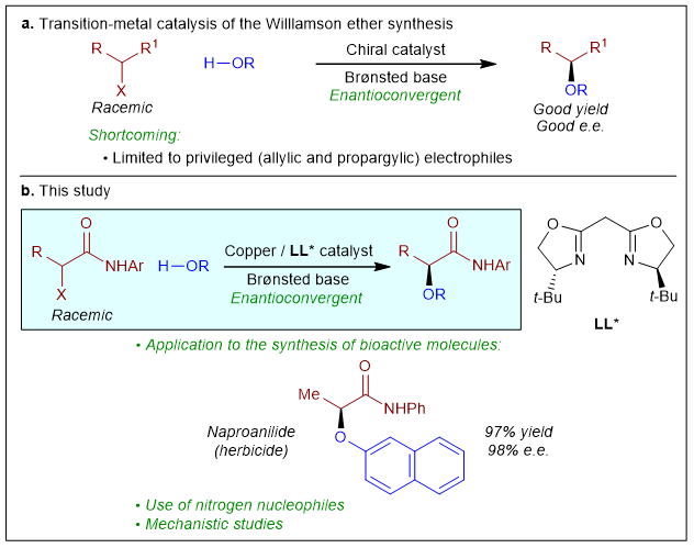 陈才友/Gregory C. Fu教授通过引入Cu/手性噁唑啉催化剂,成功实现了alpha-卤代二级酰胺与一系列的氧亲核试剂(广泛的酚、醇等)的不对称C-O成键反应。此外,该催化体系除了能实现不对称C-O成键反应外,还能高效实现不对称C-N成键反应,其中包括挑战性的苯胺和未保护的烷基胺与烷基亲电试剂的C-N成键反应。该体系能用于合成广泛的手性烷基醚和胺类化合物,其中包括直接合成IMPDH抑制剂和手性除草剂萘普草。