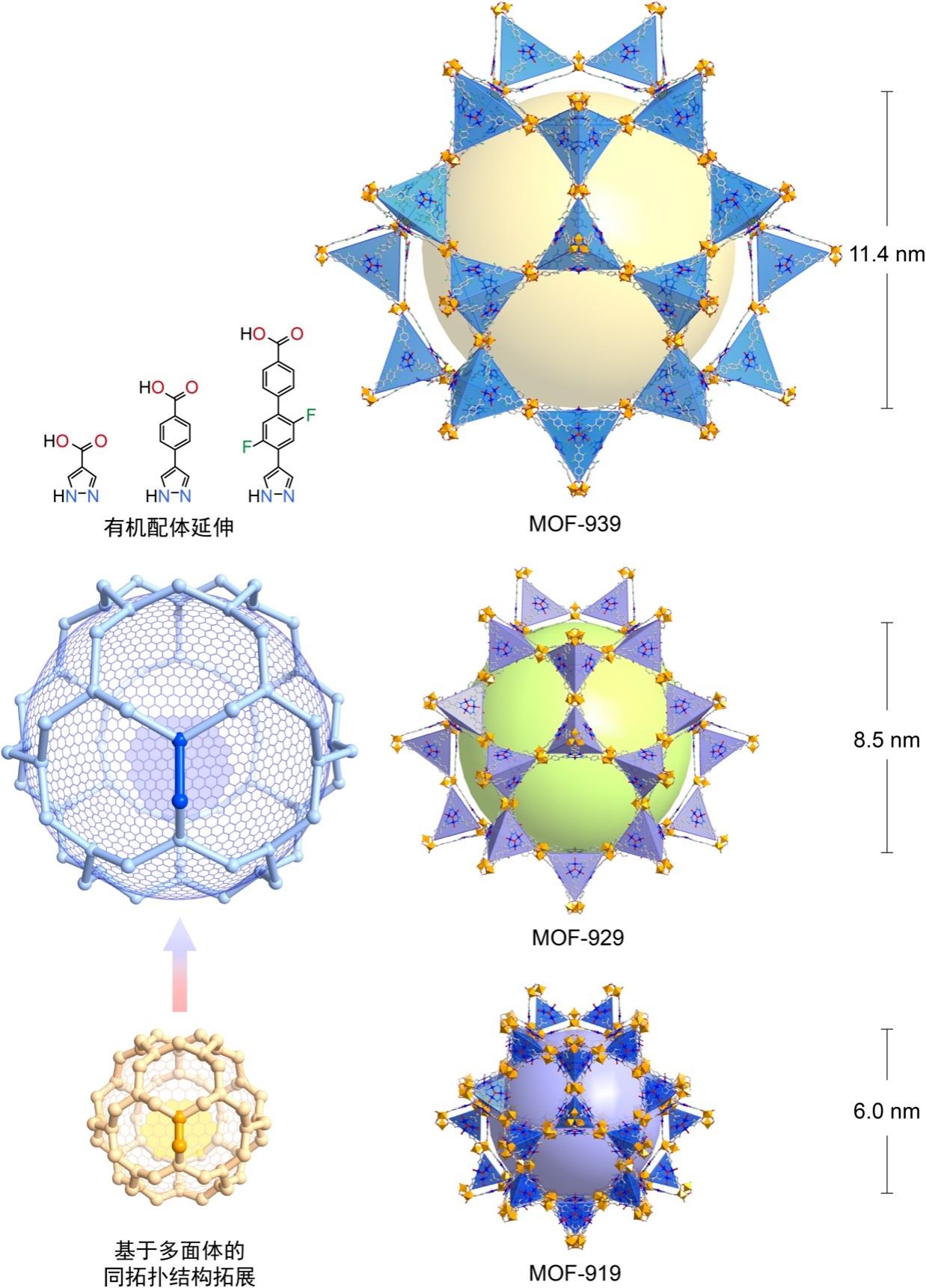 图一.基于具有高拓展效率多面体的MOF晶体同拓扑结构合成,在MOF-939中获得创纪录的11.4 nm笼状孔道。