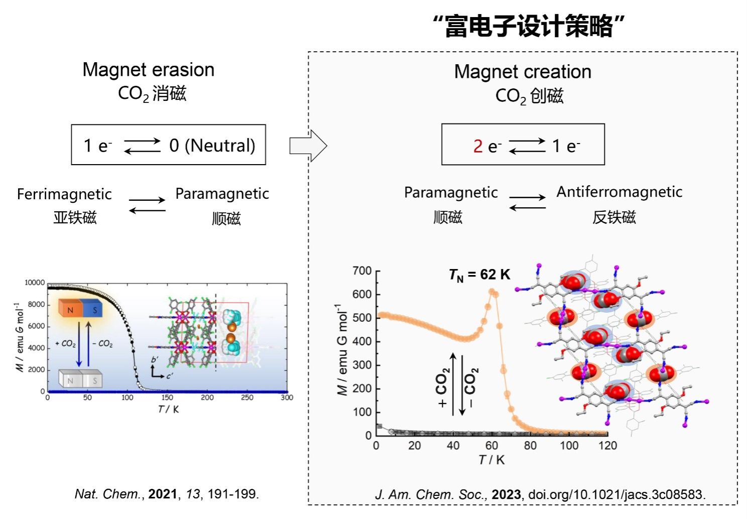 针对上述挑战,张俊教授联合日本研究小组提出一种 “富电子设计策略”,用于指导设计合成多电子转移型多孔磁体。该团队设计并成功合成了具有顺磁行为的2 e−转移型多孔磁体,吸附CO2后,Ru(II)二聚体电子态也由Ru2II,III转变为Ru2II,II,电子转移数由2 e−变为1 e−,实验上成功观测到了顺磁体和反铁磁体之间的转换,首次展示了气体诱导创磁的研究范例。该研究助力刺激响应型分子磁体的发展,为开发新型气体传感和存储功能分子器件提供了前沿探索。